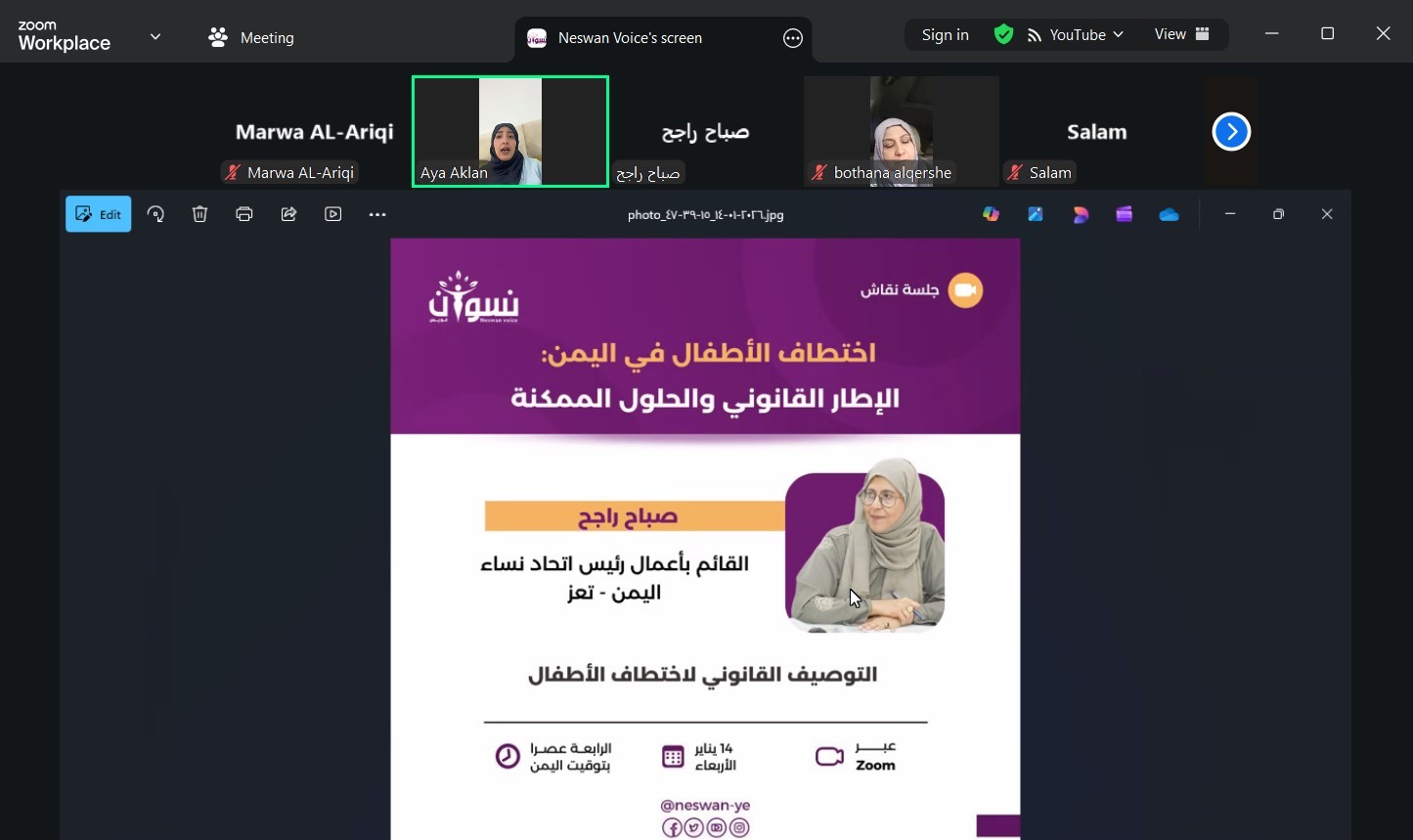 نظَّمت منصة نسوان فويس، اليوم الأربعاء، جلسة حوار عبر تقنية الاتصال المرئي “الزوم” بعنوان : اختطاف الأطفال في اليمن: الإطار القانوني والحلول الممكنة، بحضور مجموعة من الحقوقيين والمهتمين بهذا الشأن.