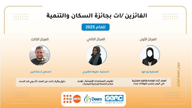 وجاء فوز نورا عن قصتها “إساءة معاملة النساء أثناء الولادة في اليمن”، فيما حصدت لطيفة المركز الثاني عن قصتها “تقليص المساعدات الإنسانية في اليمن تهديد للصحة الإنجابية في اليمن”، ونال الصحافي أسامة أمين المركز الثالث عن قصته “حلول وآليات للحد من العنف الأسري ضد النساء”.