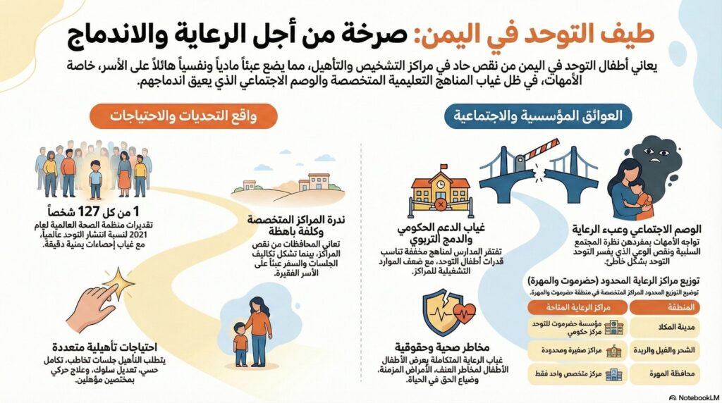 تتكرر قصة أم محمد مع كثير من الأسر في اليمن، حيث تعاني خدمات تشخيص وتأهيل الأطفال المصابين باضطراب طيف التوحد من نقص واضح في المراكز المتخصصة.
