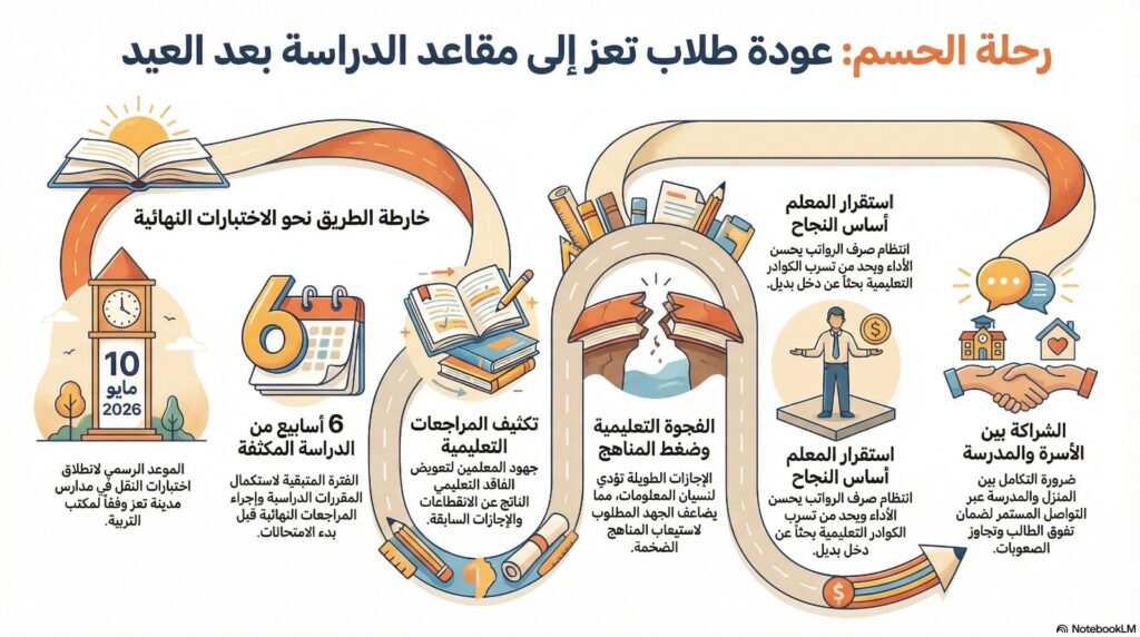 في ظل هذه المعطيات، تبدو عودة طلاب تعز إلى المدارس بعد إجازة عيد الفطر خطوة مهمة نحو استكمال العام الدراسي، لكنها في الوقت ذاته تكشف عن جملة من التحديات التي لا تزال بحاجة إلى معالجة، بدءًا من أوضاع المعلمين، مرورًا باستقرار التقويم الدراسي، وانتهاءً بتعزيز الشراكة بين المدرسة والأسرة.